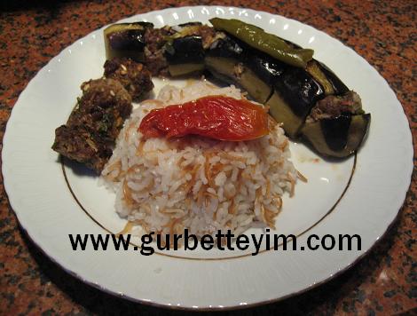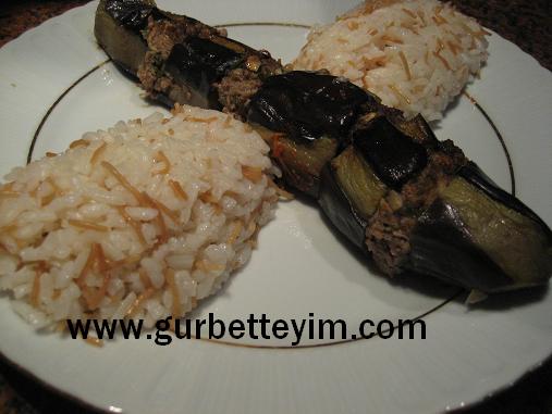- Kıymalı harçtan parçalar alarak patlıcan dilimlerinin arasına koyalım.